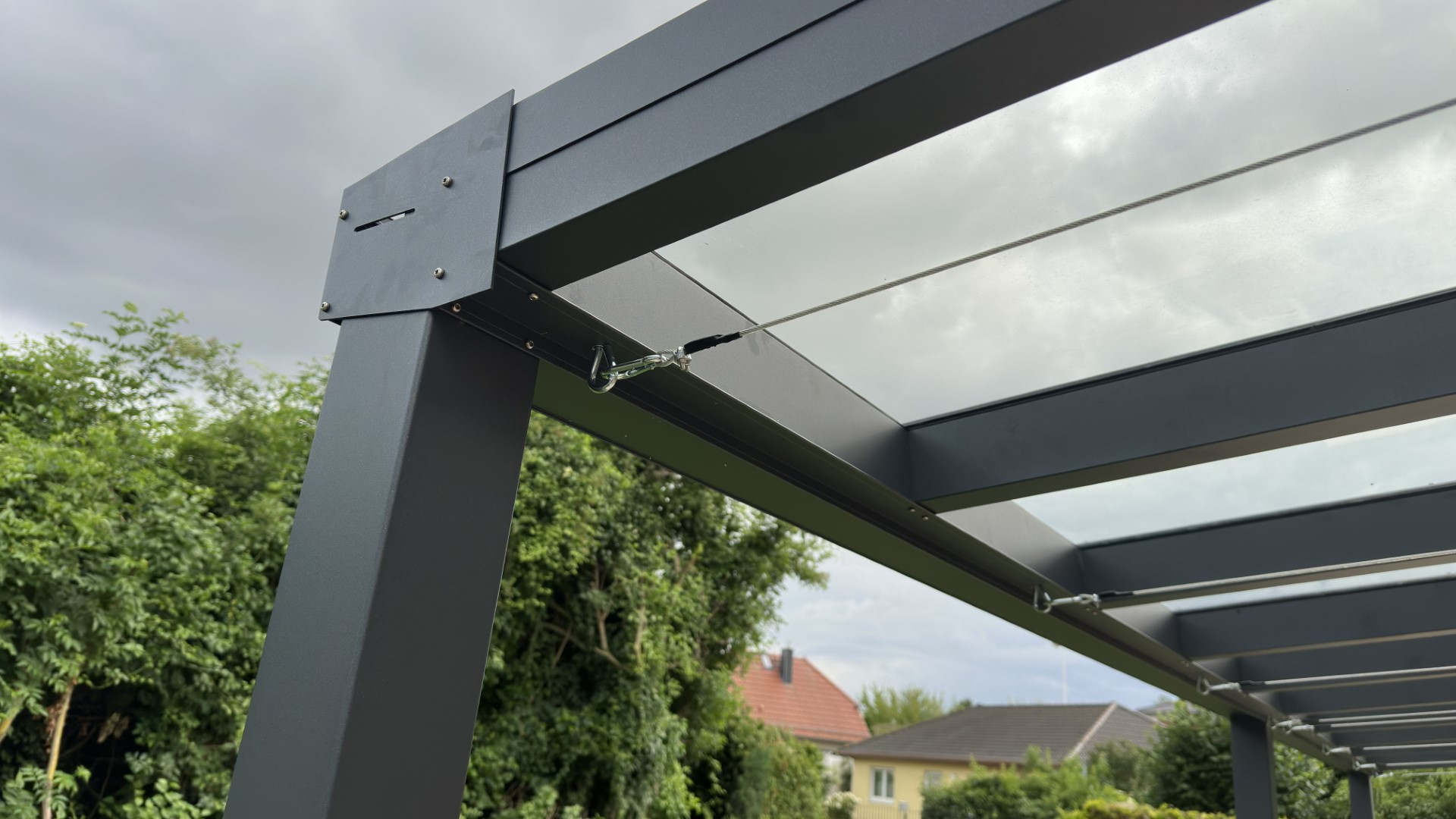Zadaszenie zostało dokładnie dopasowane do wymiarów tarasu i układu działki. Dzięki temu pergola prezentuje się bardzo estetycznie, a jednocześnie zapewnia maksymalną funkcjonalność. Pod zadaszeniem z powodzeniem można ustawić stół, leżaki lub zestaw wypoczynkowy – niezależnie od pogody.