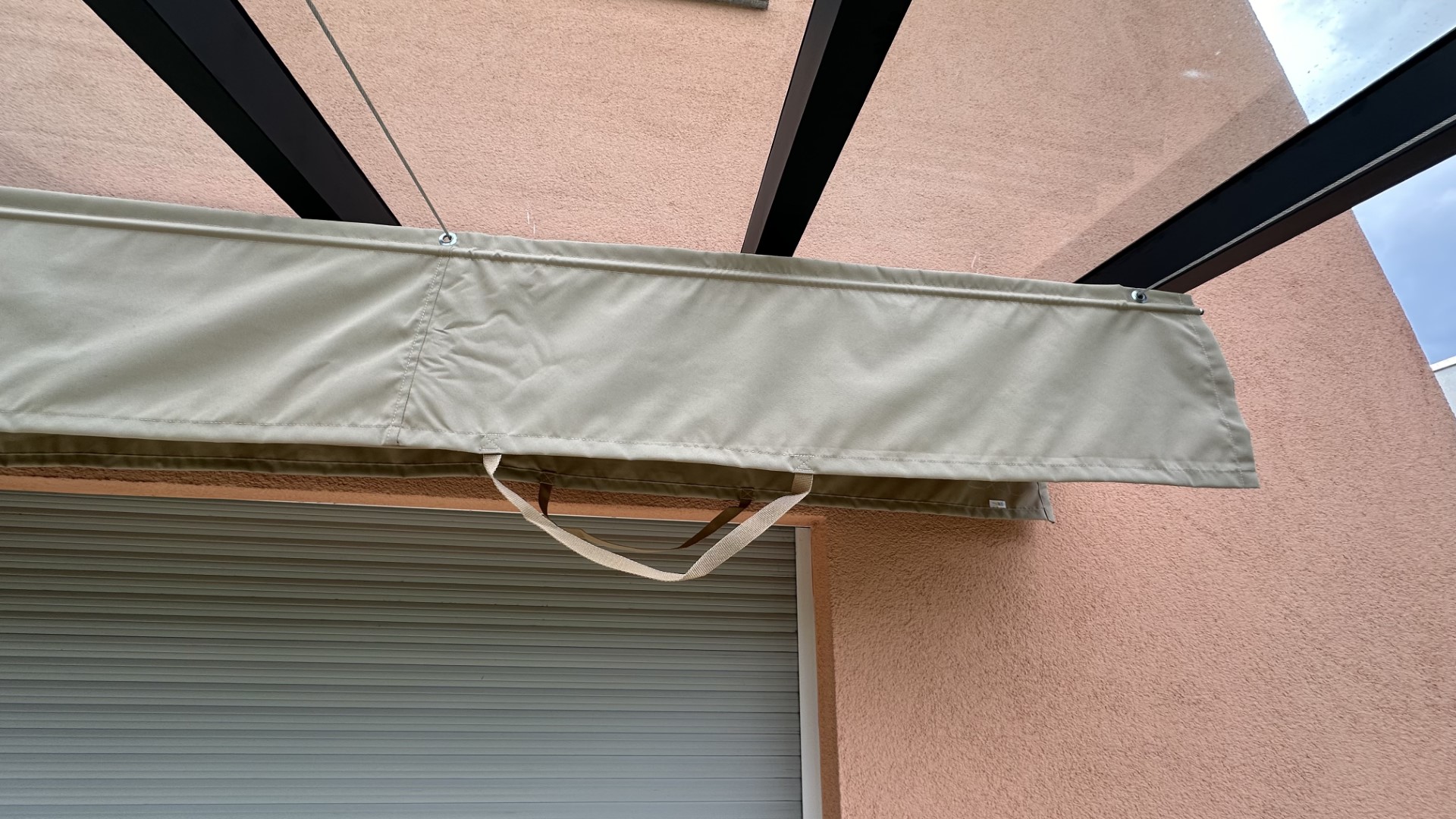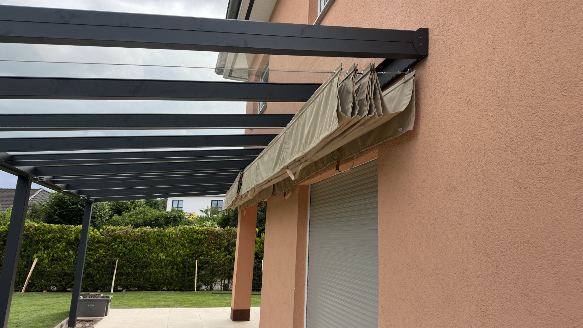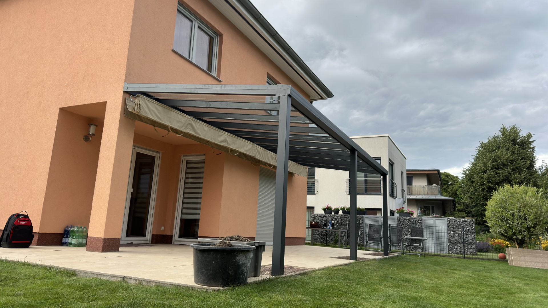 Konstrukcja powstała z trwałych profili aluminiowych w kolorze antracytowym, które świetnie kontrastują z elewacją w odcieniu brzoskwiniowym. Dach pergoli wyposażyliśmy w tkaninową markizę przeciwsłoneczną – rozkładaną manualnie lub elektrycznie. Dzięki niej użytkownicy mogą w każdej chwili dostosować poziom zacienienia do aktualnych warunków pogodowych.