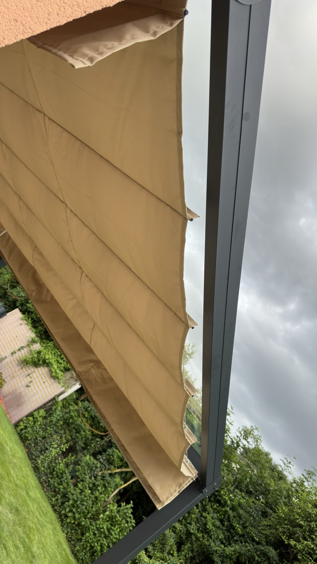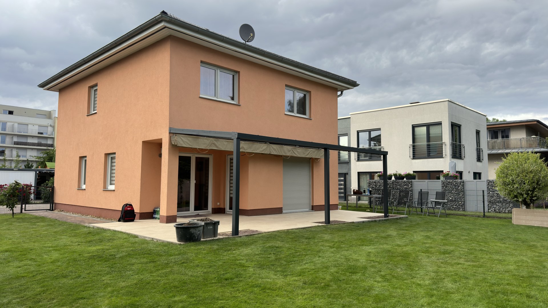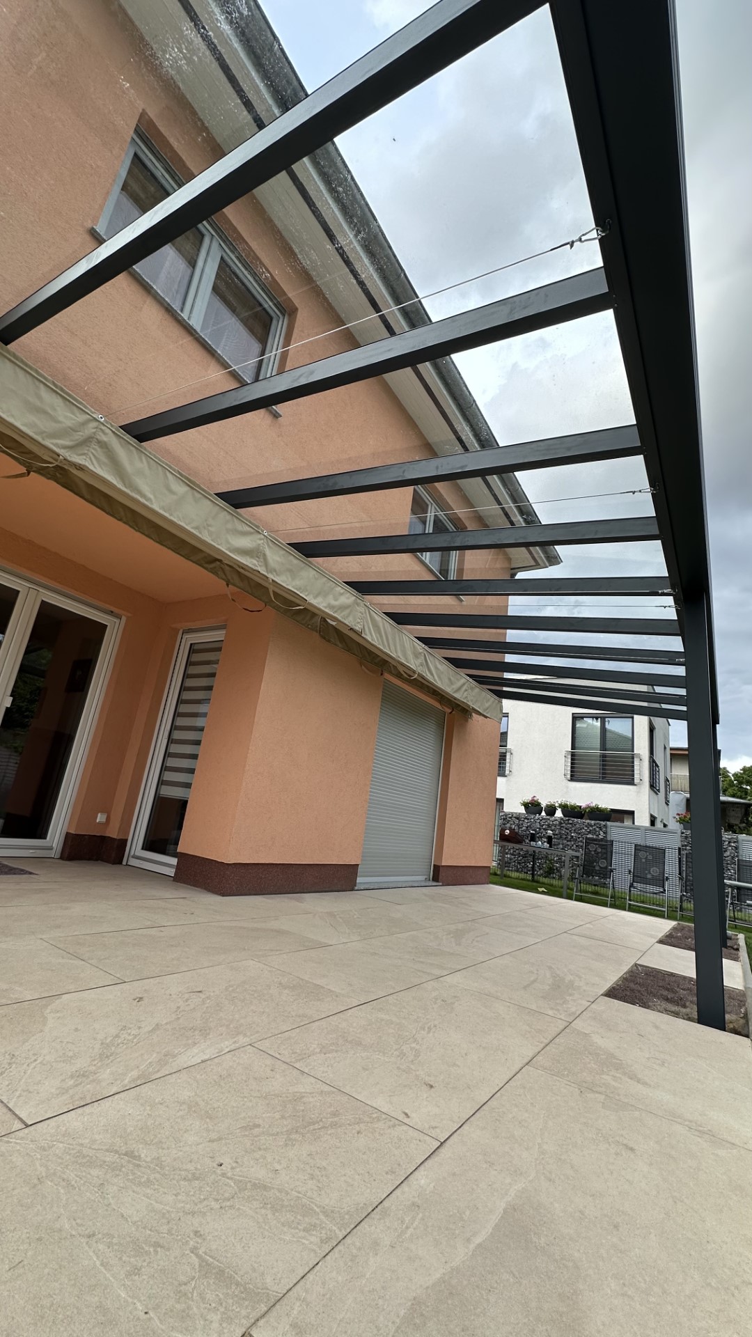 Konstrukcja powstała z trwałych profili aluminiowych w kolorze antracytowym, które świetnie kontrastują z elewacją w odcieniu brzoskwiniowym. Dach pergoli wyposażyliśmy w tkaninową markizę przeciwsłoneczną – rozkładaną manualnie lub elektrycznie. Dzięki niej użytkownicy mogą w każdej chwili dostosować poziom zacienienia do aktualnych warunków pogodowych.