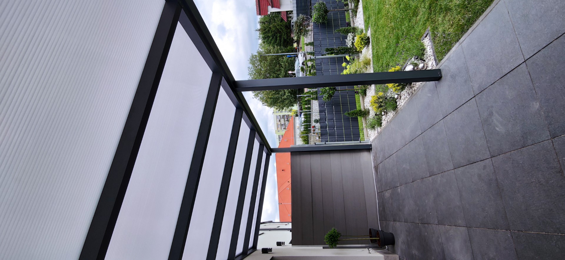 Konstrukcja pergoli powstała z trwałego aluminium w kolorze antracytowym. Dzięki zastosowaniu malowania proszkowego zachowuje swój wygląd przez wiele lat bez potrzeby konserwacji. Uzupełniliśmy ją dachem z poliwęglanu, który idealnie przepuszcza światło dzienne, a jednocześnie zapewnia ochronę przed opadami i promieniowaniem UV.