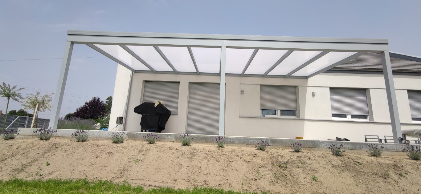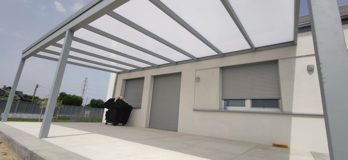 W tym projekcie zastosowaliśmy aluminiową pergolę o minimalistycznym kształcie. Antracytowa kolorystyka wpisuje się w nowoczesny charakter budynku i dobrze kontrastuje z jasną elewacją. Całość uzupełnia dach z mlecznego poliwęglanu, który zatrzymuje promienie UV i deszcz, a jednocześnie wpuszcza odpowiednią ilość światła.
